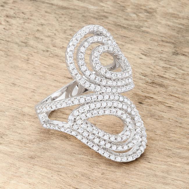 Small clear stones accent a contemporary double-looped wrap style ring for a cool glamorous look. A modern statement piece.