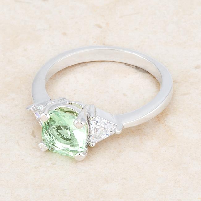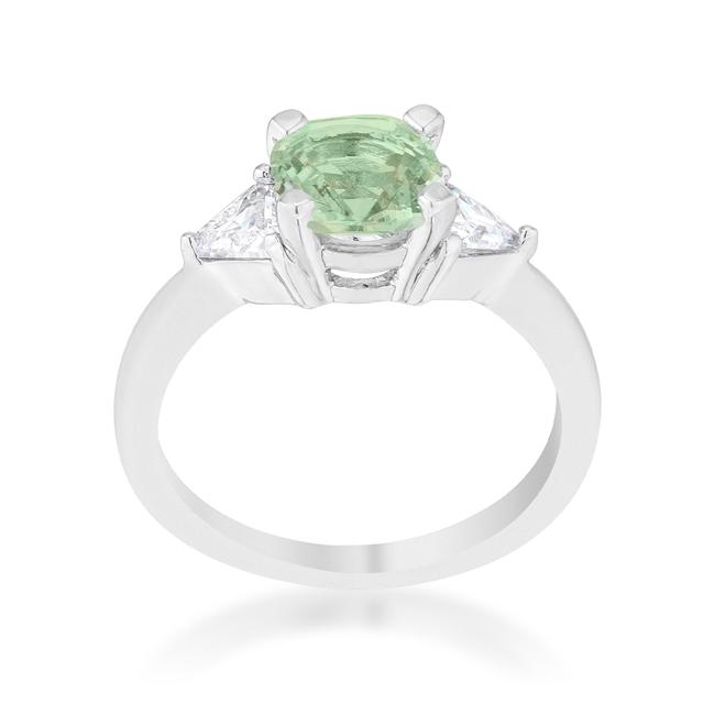 A pair of clear trillion cut stones accompany a peridot cushion cut center stone in this elegantly simple 1.8 carat engagement ring. A modern twist on a classic piece.