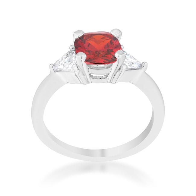 A pair of clear trillion cut stones accompany a ruby cushion cut center stone in this elegantly simple 1.8 carat engagement ring. A modern twist on a classic piece.