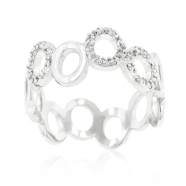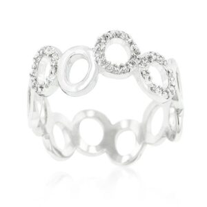 This unique style eternity band is definitely a must-have! Our genuine rhodium finish is achieved using an electroplating process that coats the item with heavy layers of rhodium a close cousin to platinum which gives our jewelry a platinum luster.