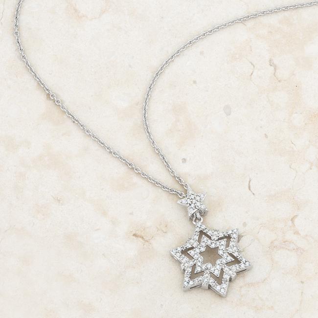Clear stones accent the star design of this classic drop necklace- subtle sparkle perfect for every woman’s collection. Our genuine rhodium finish is achieved using an electroplating process that coats the item with heavy layers of rhodium a close cousin to platinum. This gives our jewelry a platinum luster.