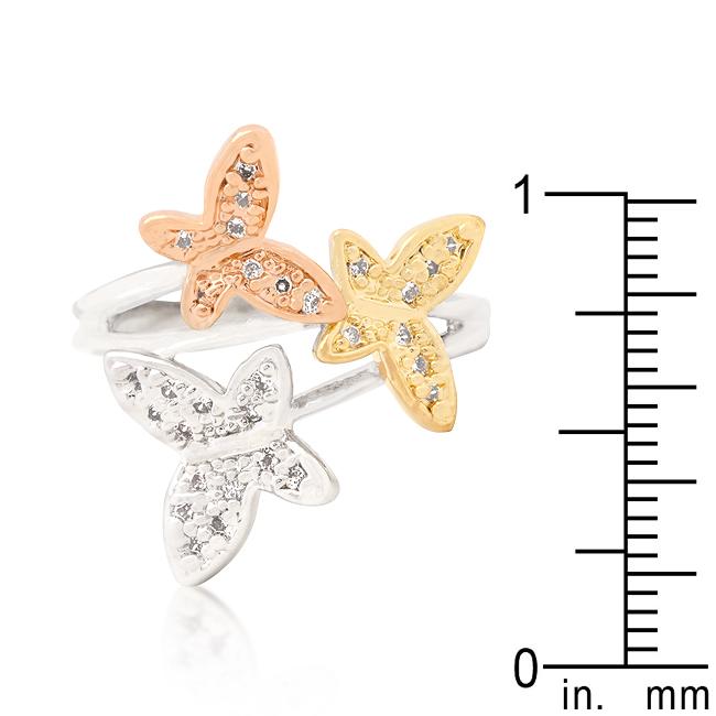 A trio of gold rose and silver colored butterflies centered with sparkling cubic zirconia adorn this ring. Our two-tone and tri-tone process use 18k gold that electroplated coating the item with heavy layers of 18k yellow gold giving it that 14k hamiliton gold polished look. The silver tone is achieved by applying a heavy coating of genuine rhodium to the item giving is a lustrous silver tone high polish.