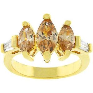 The Triple Marquise Champagne Ring brews from a classic triplet design concept. Three marquis cut stones of champagne color pop extravagantly while two baguette cut stones sparkle. Together the stonework makes for a beautiful combination. 18k plated gold is achieved using an electroplating process that coats the item with heavy layers of 18k Yellow Gold and color-treated to display a perfect 14k Hamilton gold color.