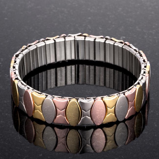 This beautiful bracelet has a lot of personality with its colorful hues and bold alternating ovals. With goldtone to stress value silvertone to stress integrity and rosegold to stress warmth and love.