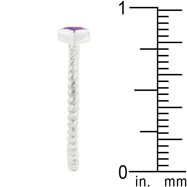 This petite solitaire ring features a unique twisting shank and a pretty amethyst cubic zirconia. Genuine Rhodium Plating is achieved using an electroplating process that coats the item with heavy layers of rhodium a close cousin to platinum which gives our jewelry a platinum luster.