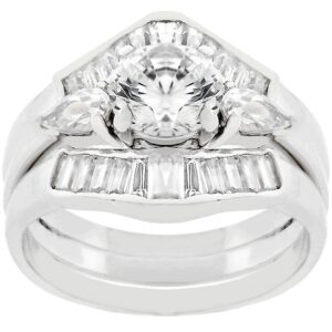 This ring set is centered by a round cut cubic zirconia and bordered by two pair shaped cubic zirconia. Channel set cubic zirconia accentuate this set. Genuine Rhodium Plating is achieved using an electroplating process that coats the item with heavy layers of rhodium a close cousin to platinum which gives our jewelry a platinum luster.