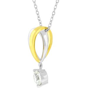 The two-tone Raindrop Cubic Zirconia Pendant is one of our most classy pieces. It features an icy round cut clear cubic zirconia hanging from two-tone bands. Our two-tone and tri-tone process use 18k gold that electroplated coating the item with heavy layers of 18k yellow gold giving it that 14k hamiliton gold polished look. The silver tone is achieved by applying a heavy coating of genuine rhodium to the item giving is a lustrous silver tone high polish.