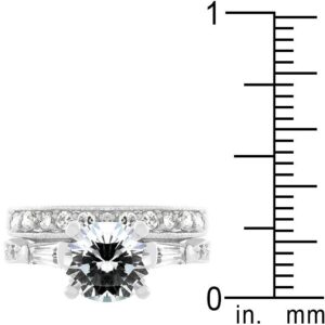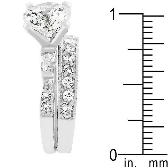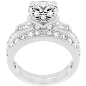 This bridal set is stunning from all angles. A two carat cubic zirconia is centered and shouldered by baguettes and round cut zirconia. The matching wedding band features channel set cubic zirconia and accented milgrain. Genuine Rhodium Plating is achieved using an electroplating process that coats the item with heavy layers of rhodium a close cousin to platinum which gives our jewelry a platinum luster.